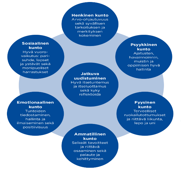 Ammatillinen kunto tarkoittaa sitä, että työllämme on selkeät päämäärät, meillä on siihen riittävä osaaminen, saamme palautetta suorituksestamme ja kehitymme jatkuvasti. Hyvä fyysinen kunto on kaiken lähtökohta. Fyysinen kunto merkitsee terveellisiä ruokailutottumuksia ja riittävää liikuntaa, lepoa ja unta. Sen lisäksi tarvitaan psyykkistä kuntoa, joka on ajatusten, havainnoinnin, muistin ja oppimisen hyvää hallintaa. Emotionaalinen kunto tarkoittaa, että yksilö kykenee tunnistamaan, ilmaisemaan ja hallitsemaan tunteensa, arvostaa itseään ja pystyy elämään suhteellisen onnellista elämää.