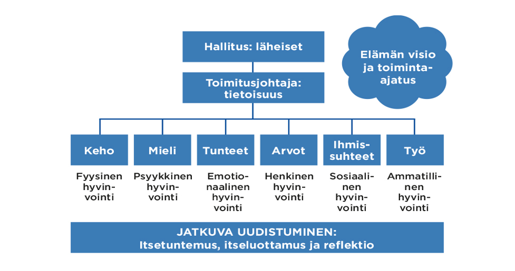 Yrityksessämme on kehon, mielen, tunteiden, arvojen, ihmissuhteiden ja työn osasto. Nämä osastot hoitavat vastaavasti fyysisiä, psyykkisiä, emotionaalisia, henkisiä, sosiaalisia ja ammatillisia toimintoja. Lisäksi meillä on uudistumiseen keskittynyt kehitysosasto tai -prosessi. Henkilökohtainen visio ja tavoitteet antavat suuntaa elämällemme. Toimitusjohtajana toimii tietoisuutemme eli ydinminuutemme.