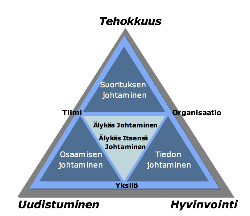 Johtamisjärjestelmän on tasapainotettava erilaisia, useasti ristiriitaisiakin tavoitteita. Älykäs organisaatio osaa tasapainottaa kolmea tekijää, jotka ovat elintärkeitä organisaation olemassaololle pitkällä tähtäimellä. Nämä ovat tehokkuus, uudistuminen ja hyvinvointi. Älykäs organisaatio toimii tehokkaasti, jotta se on kilpailukykyinen. Toiseksi älykäs organisaatio panostaa jatkuvasti oppimiseen ja uudistumiseen. Tällä tavoin se varmistaa myös tulevaisuuden elinvoimaisuuden ja kilpailukyvyn. Kolmanneksi älykäs organisaatio pitää hyvää huolta hyvinvoinnistaan. Tällä se varmistaa, että sen henkilöstö jaksaa pitkällä tähtäimellä tehdä tulosta, uudistua ja voida hyvin.